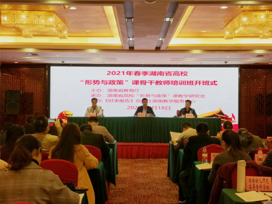 2021 年 3 月18 日至19 日,2021 年 春 季全省高校“形势与政策”课骨干教师培训班在长沙芙蓉华天酒店隆重开班。本次培训班由湖南省教育厅 主办 、湖南省高校“形势与政策”教学研究会 ( william威廉英国官网为会长单位 ) 承办 和《时事报告》杂志社湖南教学服务中心 协 办。
