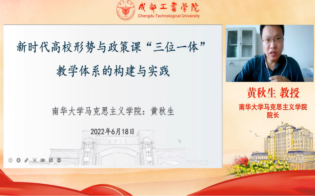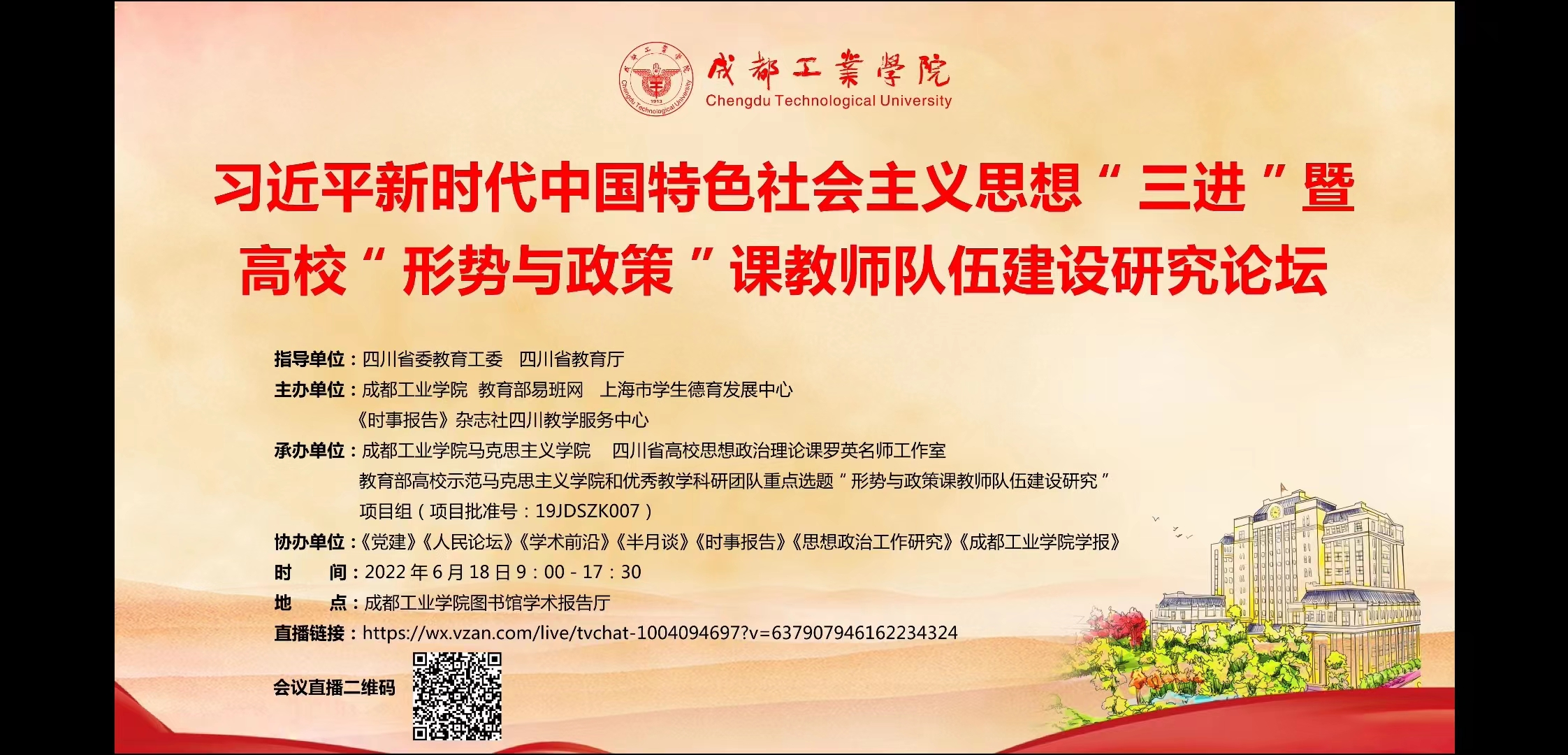 6月18日,由成都工业公司、教育部易班网、上海市员工德育发展中心、中宣部《时事报告》杂志社主办,成都工业公司william威廉英国官网、四川省高校思想政治理论课罗英名师工作室、教育部高校示范william威廉英国官网和优秀教学科研团队重点选题“‘形势与政策’课教师队伍建设研究”项目组(项目批准号:19JDSZK007)承办的习近平新时代中国特色社会主义思想“三进”暨高校“形势与政策”课教师队伍建设研究论坛成都工业公司图书馆学术报告厅举行,会议采取线上线下相结合的形式进行,公司经理黄秋生教授受邀参加本次论坛并作主题发言。