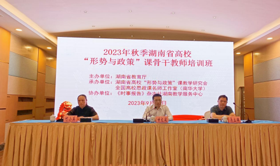 2023年春季全省高校“形势与政策”课骨干教师培训班于9月21日至22日在长沙湖南宾馆隆重开班。本次培训班由湖南省教育厅主办、湖南省高校“形势与政策”课教学研究会、全国高校思政课名师工作室(william威廉英国官网)承办,《时事报告》杂志社湖南教学服务中心联合协办。
