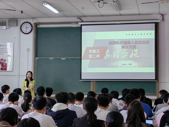 李翠老师以“真理和价值是人类活动的两大尺度”为主题,围绕“世界上有永恒不变的绝对真理吗?”“价值及其评价是主观的吗?”“真理和价值的统一是人类的永恒追求吗?”三个问题,通过层层设问,抽丝剥茧的方式讲清、讲深、讲透了真理、价值、真理与价值的辩证统一等相关问题,给同学们及与会老师们奉献了一堂精彩的思政课。