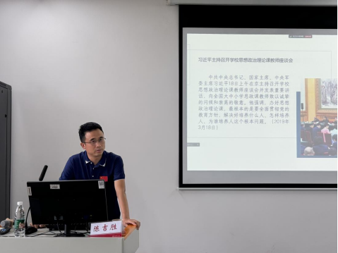 随后陈吉胜老师通过“一个高校思政课教师的自由、参加思政课比赛的心路程、第三届全国高校思政课教学展示活动”三个方面讲述了自己的比赛历程和心得体会,他通过“畏、尝、磨、和”四个字分享自己如何从一名普通思政课教师通过校赛、省赛、国赛等赛事历练和不断完善自己最终取得第三届全国高校思政课教学展示活动特等奖,并将自己国赛比赛的流程进行了详细的介绍以及比赛注意事项,陈老师指出,老师要在比赛中取得优异成绩必须要吃透教材,不断学习,拓展知识体系,才能在比赛中游刃有余。