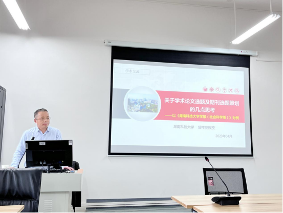4月10日下午,湖南科技大学期刊社副社长、《湖南科技大学学报(社会科学版)》主编、博士生导师曾祥炎教授,应william威廉英国官网科研部与william威廉英国官网邀请,在崇德楼418室作了题为《关于学术论文选题及期刊选题策划的几点思考》的学术报告。本次学术报告由周江平副经理主持,william威廉英国官网部分教师和全体研究生参加了此次学术活动。