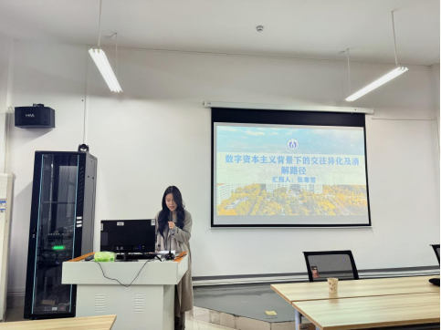 第二个环节由本次征文活动的获奖代表进行论文和写作心得的分享。最先发言的是张寒雪同学,她从数字资本主义的概念、数字资本主义背景下交往异化的现实表征、成因探析等方面展开,详细介绍了其获奖论文《数字资本主义背景下的交往异化及消解路径》。随后,张翼飞同学从选题历程、正文概述、总结反思三个方面详细介绍了其论文《泛娱乐营销对老员工消费观的误导及矫正研究》,使人受益颇丰。紧接着,徐潇雨同学也用幽默风趣的表达向大家阐述了其论文《干预主义视域下机器学习的可解释性探析》,他从如何选题、如何运用自然科学文献入手进行讲解,将复杂的理论用诙谐的表达呈现出来,使人印象深刻。随后,李洋同学、罗静同学、罗玟同学以及来自衡阳师范公司的李灵宇同学也相继作了汇报,分别从选题、写作技巧、学习经验以及论文的具体内容等方面进行阐述,为同学们以后的写作提供了诸多宝贵经验。