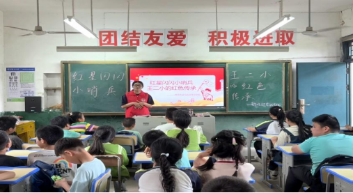 课堂主题为“红星闪闪小哨兵,王二小的红色传承”,主讲人胡文珮向同学们介绍了抗日小英雄——王二小的故事,让同学们了解到王二小机智勇敢、不怕牺牲的精神品质。课堂气氛活跃,同学们积极发言并认真写下想对英雄王二小想说的话。有同学说:“王二小你是真正英勇无畏的英雄,因为有你才会有千千万万个像你这样的人”;也有同学说:“我会对他的事迹牢牢地记住。我们要好好学习,长大报效祖国”;还有同学说:“王二小,你的英勇事迹让我们敬佩。你不顾自身安危,为保护村庄英勇牺牲,你的精神值得我们学习”。