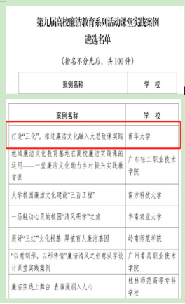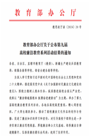 近日,教育部公布了第九届高校廉洁教育系列活动评选结果,此次活动全国共评选出100件课堂实践案例,公司工作案例《打造“三化” ,推进廉洁文化融入大思政课实践》,入选教育部廉洁教育系列活动课堂实践案例。